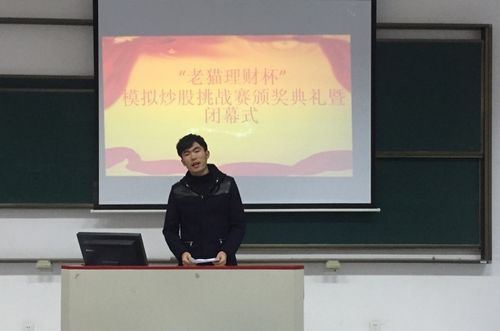 1月6日晚,由银泰证券、老猫资产管理有限公司主办,我校商学院承办的“老猫理财杯”模拟炒股挑战赛在槎轩楼109室顺利落幕。老猫资产管理有限公司的行政总监黄怡,银泰证券综合管理岗的李春燕经理,金融教研室主任吴欣颀,金融投资协会指导教师何洪亮、黎纪东等出席了本次颁奖典礼。