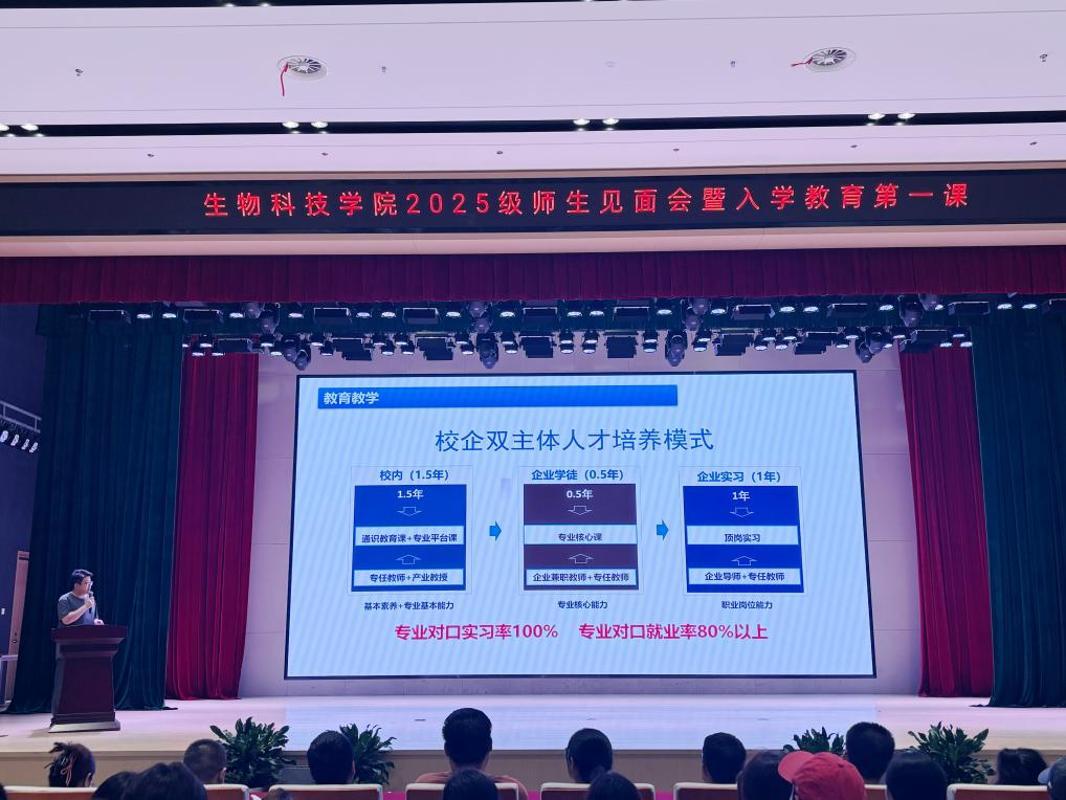 梅啸系统介绍了学院的办学实力与育人体系。他从教学体系构建、学科特色、校企合作平台建设等方面展开说明,全面展现了学院在生物医药领域的育人机制和紧密对接产业的办学特色,帮助新生深入理解学院的办学理念与人才培养能力。