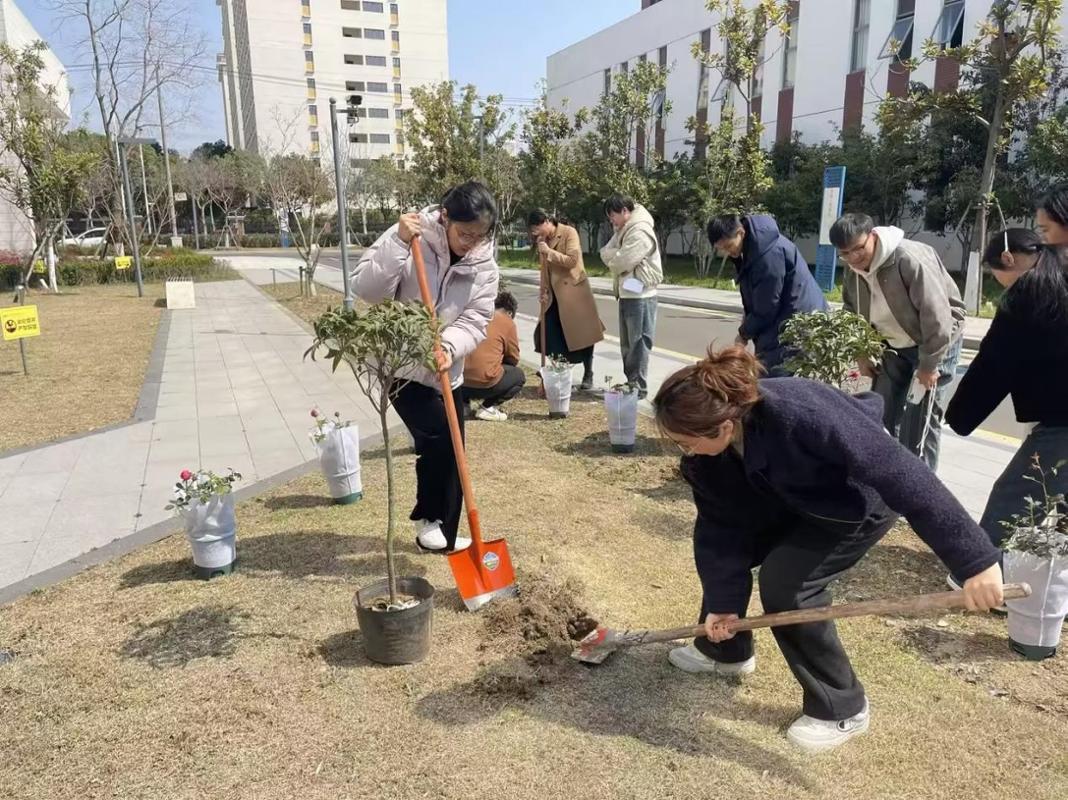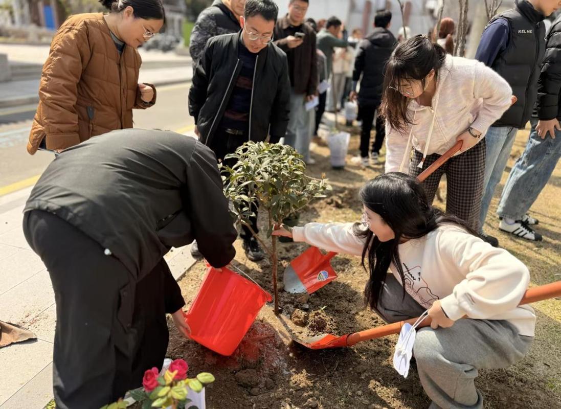铁锹翻飞,春意涌动。植树现场气氛热烈、秩序井然,师生们化身绿色使者,分组协作、默契配合。大家手持铁锹,或扶正培土,或围堰浇水,动作标准且专注,将专业知识融入劳动实践,仔细地将树苗植入沃土,压实根系。在协作劳动中,体验着耕耘之乐,感悟着生命成长的力量,春日校园里充满热火朝天的劳动景象。