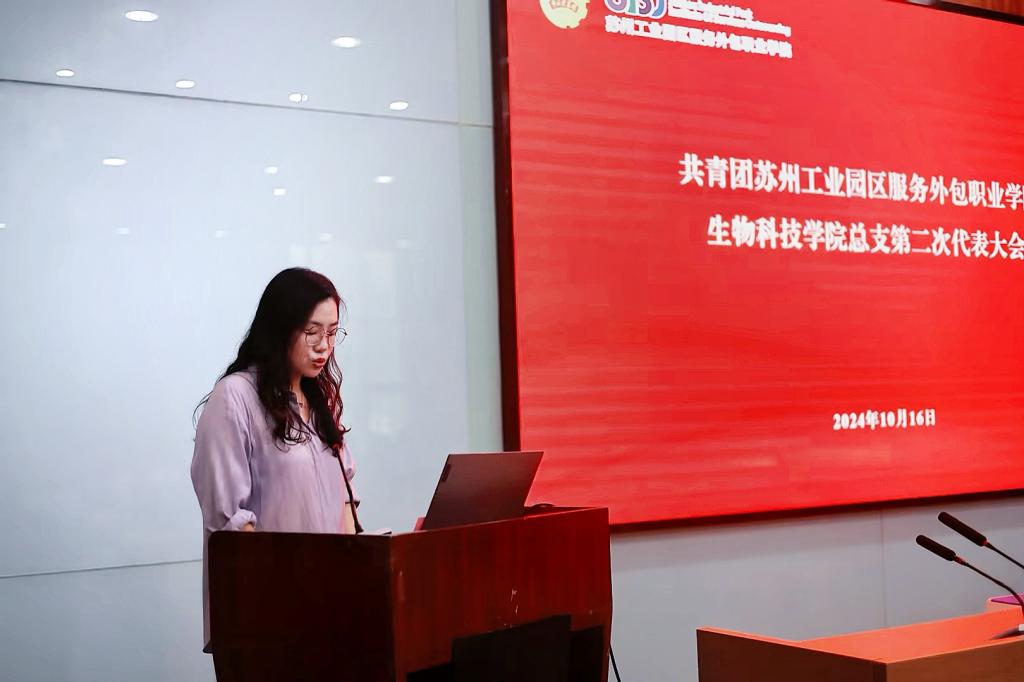 10月16日下午,共青团苏州工业园区服务外包职业学院生物科技学院总支第二次代表大会在善仁楼报告厅举行。我校团委书记李晓鸥,生物科技学院副院长卢晨、全体辅导员以及134名团员代表参加了会议。