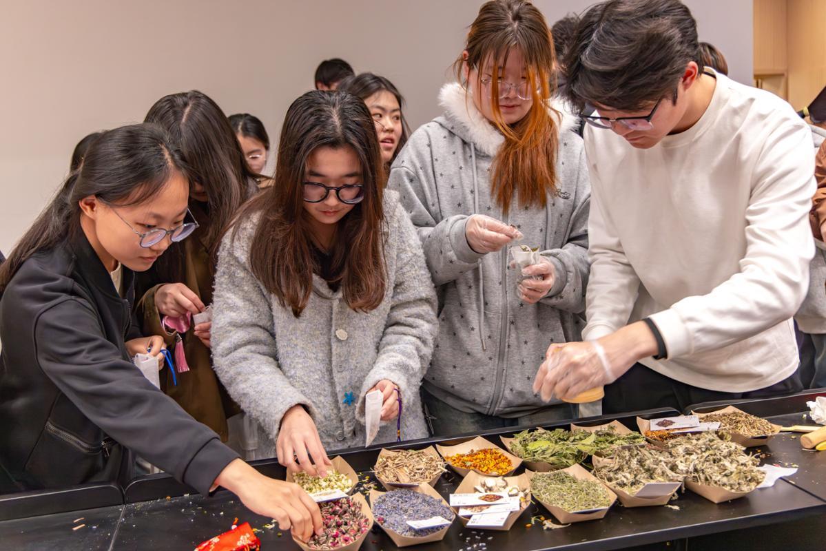 活动伊始,负责人徐琰同学为现场同学分发一次性手套、香囊布袋等物料,巧手制香囊环节正式拉开帷幕。活动现场精心准备了玫瑰花、茉莉花、丁香、合欢花、薄荷叶等多种天然香料,馥郁芬芳、琳琅满目。同学们化身“调香师”,根据个人喜好自主挑选、搭配香料,或清甜淡雅,或醇厚浓郁,每一种搭配都蕴藏着独特的春日心意。选好香料后,大家借助工具细心捣碎,让香气充分释放,再将调配好的香料小心翼翼装入香囊布袋,一个个承载着美好祝福的香囊便制作完成。指尖萦绕着香料的芬芳,现场满是欢声笑语,温馨四溢。