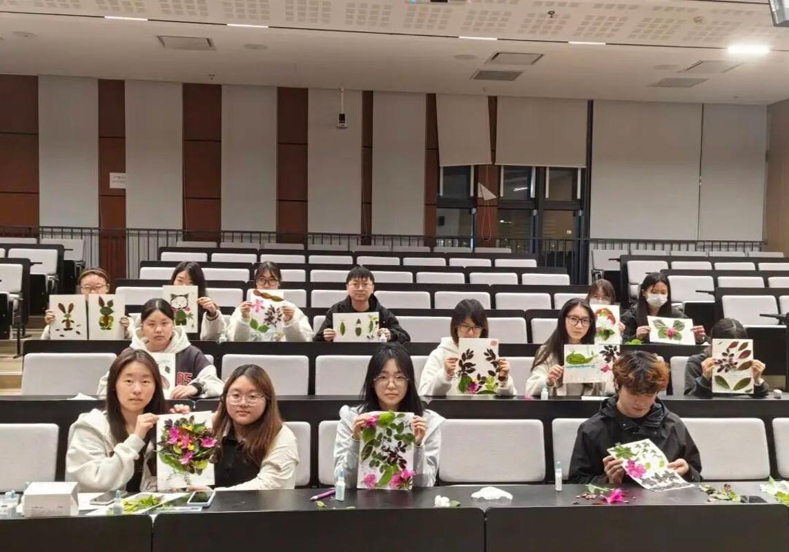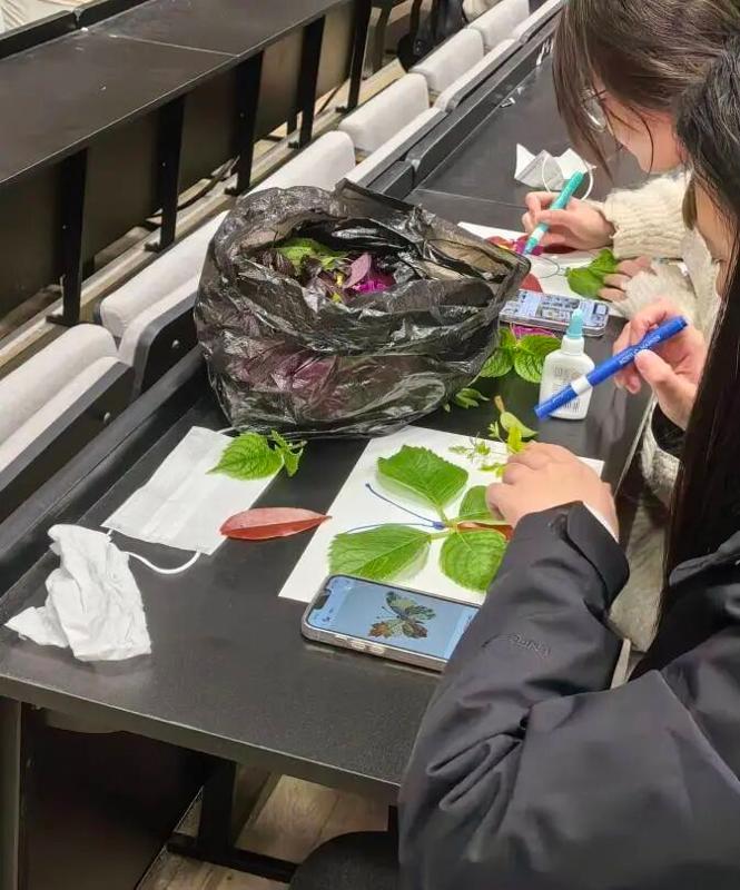 大家围坐在一起,认真挑选叶片、精心构思画面,时而低头比对形状,时而轻声交流灵感,偶尔互相协助粘贴、修剪,欢声笑语萦绕全场。原本平凡的落叶,在指尖渐渐化作生动有趣的艺术作品。同学们尽情发挥天马行空的想象力:有人将叶片拼成灵动蝴蝶、可爱小动物;有人用枝叶勾勒校园林荫道、图书馆一角;还有人融合青春与劳动元素,创作出具象又富深意的作品。每一次粘贴、每一处搭配,都藏着对校园的热爱与对青春的期许。