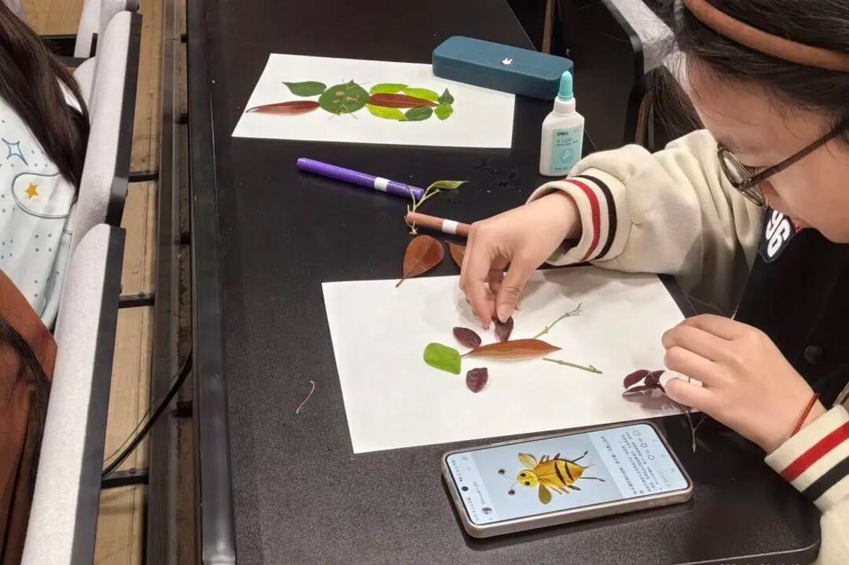 活动现场暖意融融,同学们满怀期待投入创作。桌上整齐摆放着提前收集的各色落叶 —— 翠绿的梧桐叶、鲜嫩的柳芽、舒展的荷叶尖角,还有细碎的无名小叶,每一片都带着自然纹路,既是大自然的珍贵馈赠,也是校园里随处可见的美好印记。