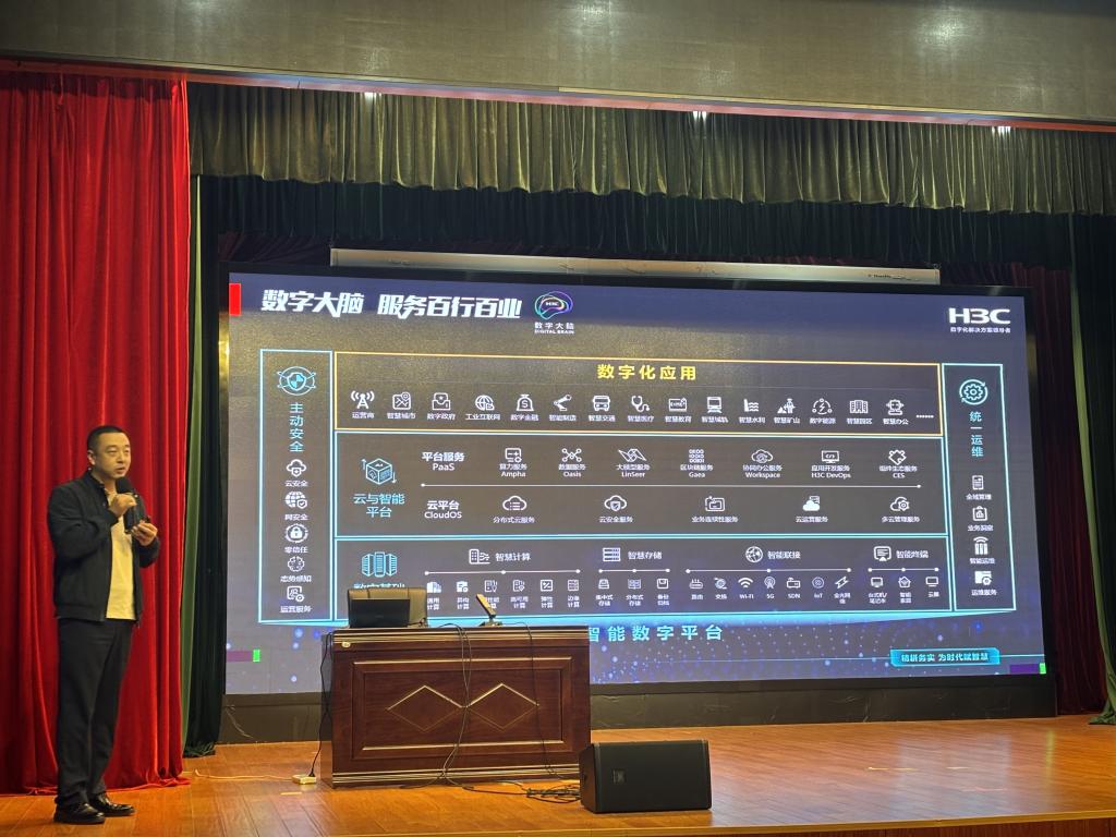 其次,屠志丹全方位介绍了新华三的“数字大脑”解决方案。该方案涵盖主动安全、云与智能平台、数字化应用、统一运维等板块,能为运营商、智慧城市、数字政府、工业互联等众多领域提供数字化服务,展现了数字技术在各行业的广泛应用场景和强大赋能能力。