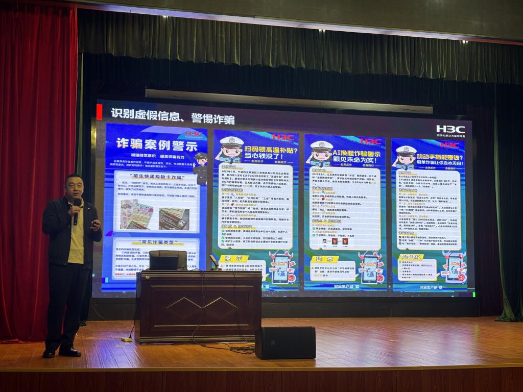 讲座现场,屠志丹特别强调了网络安全的重要性,并通过“陌生快递购物卡诈骗”“扫码领高温补贴陷阱”“AI换脸诈骗”“刷单诈骗”等案例讲解,提醒大家在数字时代要提高警惕,识别虚假信息,防范各类诈骗,保护自身财产安全。