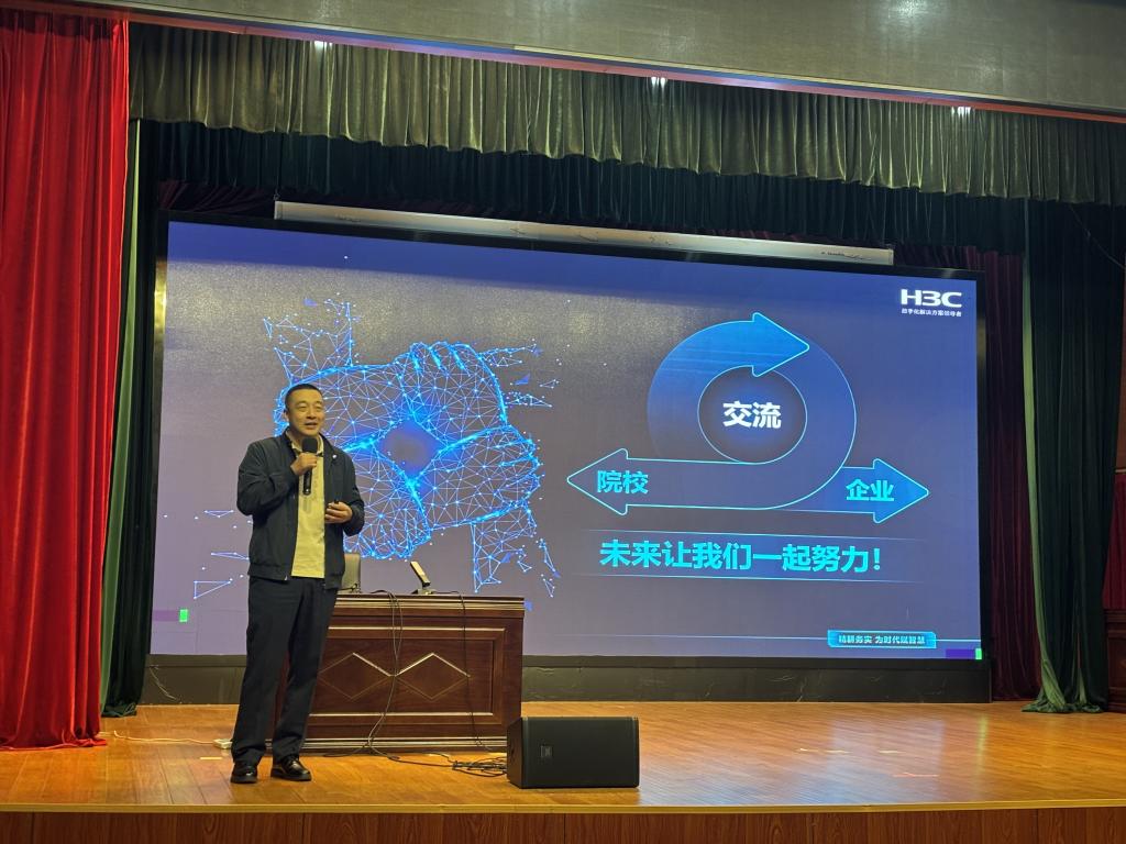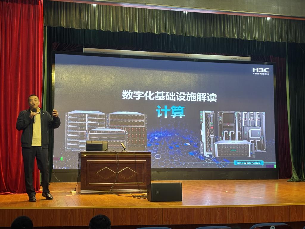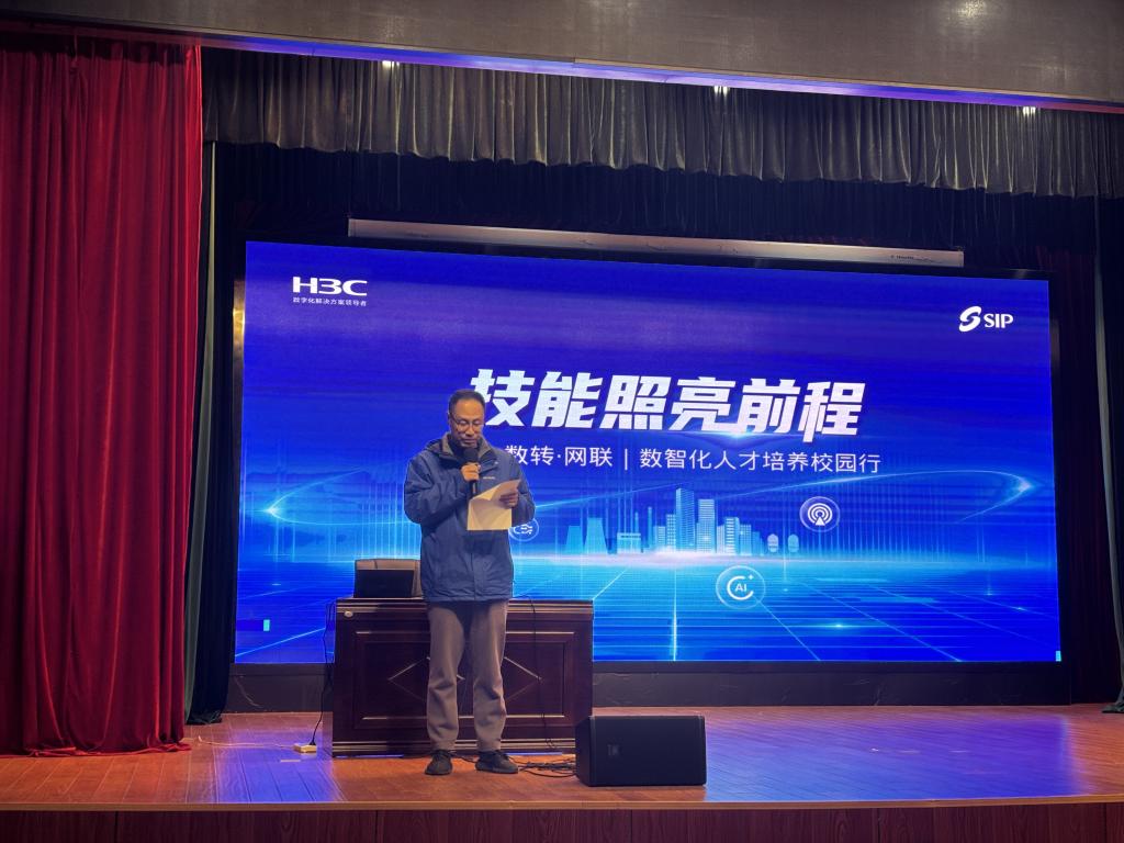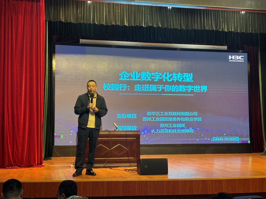 10月28日,由苏州工业园区人力资源和社会保障局指导,新华三工业互联网有限公司、我校智能管理学院主办的“技能照亮前程——数智化人才培养校园行”活动在善仁楼影剧院举行。新华三工业互联网有限公司教育发展中心主任张宇楠、高级工程师屠志丹,智能管理学院党支部书记、副院长陈强,学院专任教师孙茜以及2025级新生参加了此次活动,活动聚焦企业数字化转型,为师生们带来了一场干货满满的数字知识盛宴。