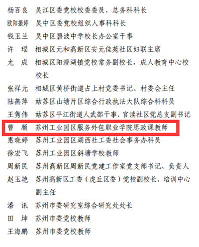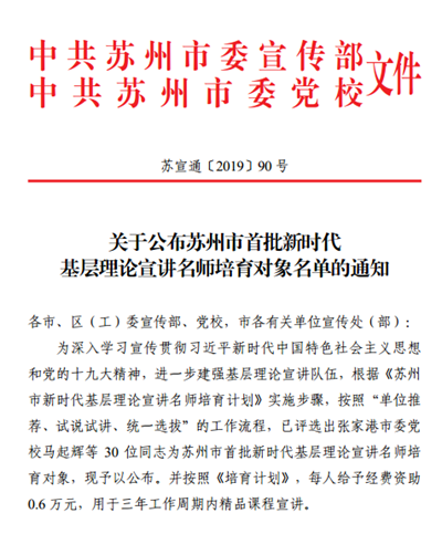 本次“基层理论宣讲名师培育对象”是根据《苏州市新时代基层理论宣讲名师培育计划》的实施步骤,按照“单位推荐、试说试讲、统一选拔”的工作流程评选出来。曹顺以《在实现中国梦的实践中放飞青春梦想》为申报课程,经过单位推荐、试说试讲等环节成功入选。