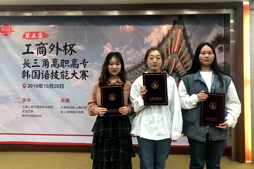 10月26日,第五届“工商外杯”长三角高职高专韩国语技能大赛在上海工商外国语职业学院举办,来自长三角地区3省1市10所高职院校的三十多名选手参与角逐。经过激烈的角逐,我校商学院老师沈婧、周律指导的采购18级肖世玉同学获得歌唱组二等奖,会计18级黄佩琪、詹诗璐同学获得演讲组及写作组人气奖,获得前往韩国研修韩国语的机会。