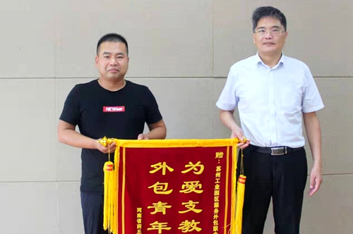 严世清对郭店小学马富勋一行表示了欢迎,向长期坚守在贫困乡村一线的教育工作者们表示了敬佩,他对我校“为爱行动”支教项目组的付出表示了肯定,未来希望不断加强与睢县白庙乡郭店小学的合作与交流,继续开展相关支教活动。会上,马富勋代表睢县白庙乡郭店小学向我校赠与了“为爱支教千里赴 外包青年好榜样”的锦旗。