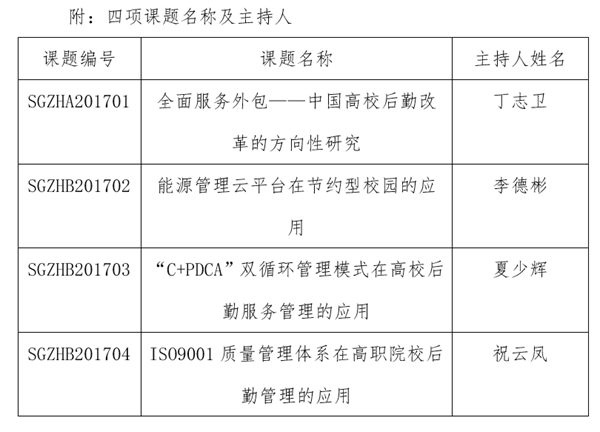6月12日,苏州市教育局发文公布了2018年度苏州高职高专院校联席会议“后勤联盟”研究课题结题验收结果,我校事务保障中心牵头的四项课题全部一次性验收通过,4项课题的数量也位居此次研究课题之首。学校副校长、副书记丁志卫牵头的题为《全面服务外包——中国高校后勤改革的方向性研究》的课题作为此次课题研究的重点课题也顺利结项。
