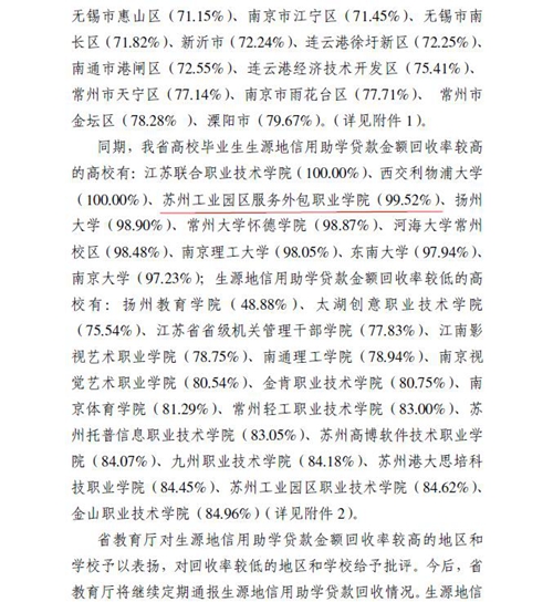 1月底,江苏省教育厅下发了《省教育厅关于2016年生源地信用助学贷款回收情况的通报》,文件中对全省各县市、各高校生源地信用助学贷款回收情况进行了通报。我校2016年生源地信用助学贷款金额回收率达到了99.52%,在全省161所高校中位列第三,受到省教育厅的通报表扬。