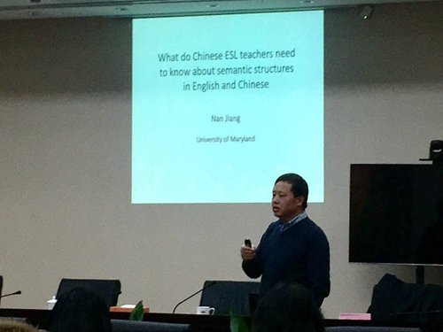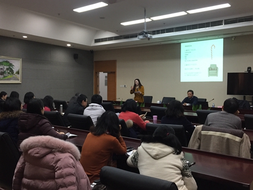 12月28日下午,我校教学服务中心、国际学院联合举办了师资培训讲座。讲座邀请了美国马里兰大学语言学、文学与文化学院蒋楠教授在我校言子楼413做了题为“汉英语义结构实证分析与研究”的学术讲座。学校全体外语老师参加了此次讲座。